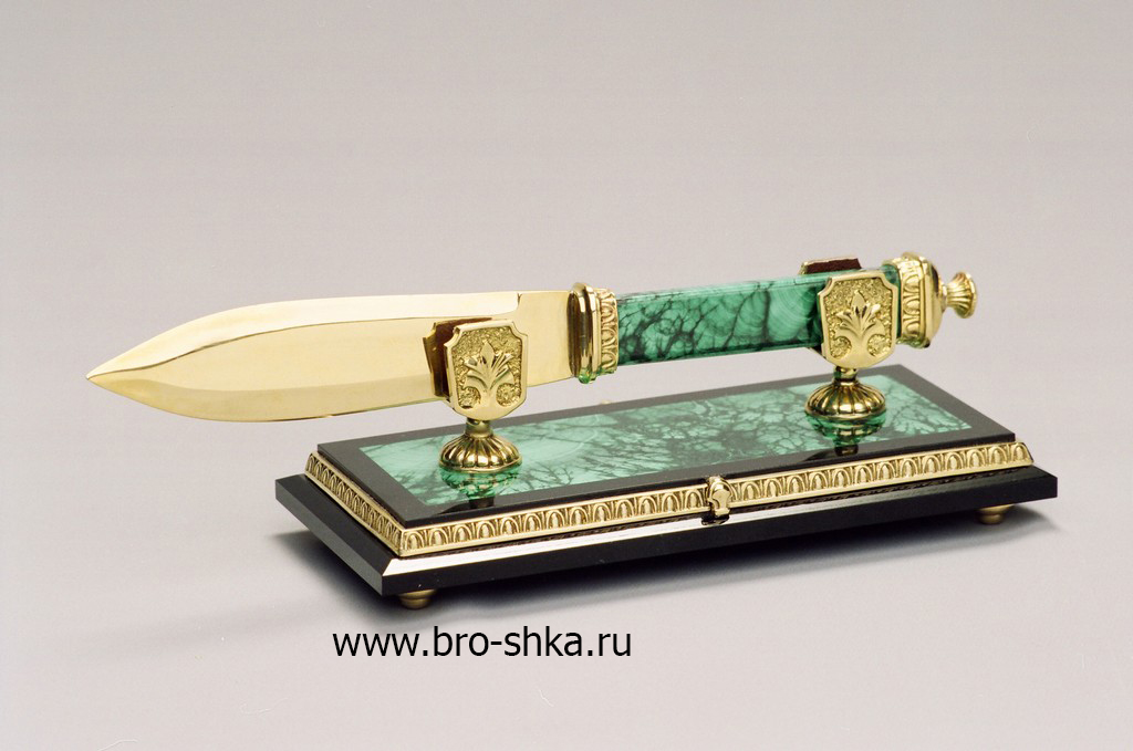 Сувенир «Нож для резки бумаг» малахит, долерит, литье и штамп - бронза, анодированная в цвет "Золото". Размеры 240*80*70 мм.