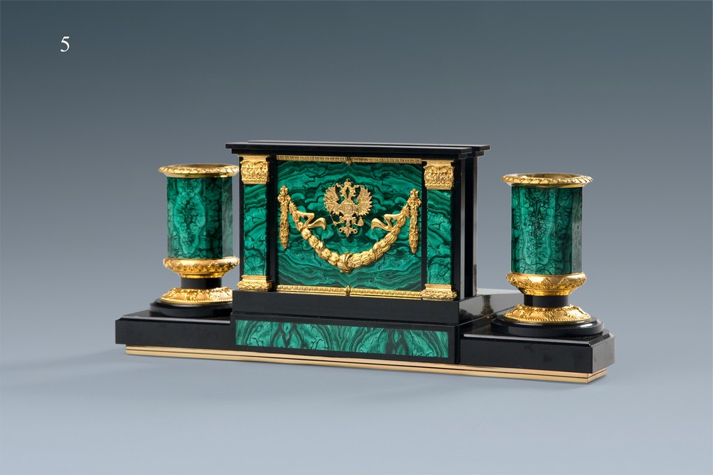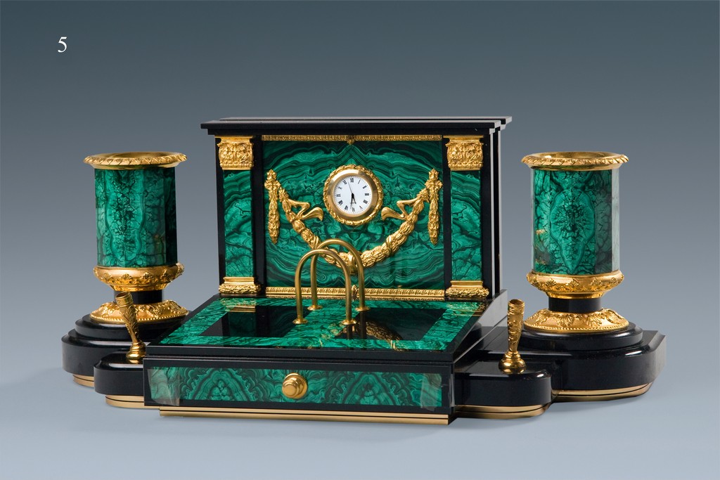 Настольный письменный набор для руководителя выполнен из материалов малахит, долерит, литья и точенные детали из бронзы, анодированные в цвет «золото». На лицевой стороне часы, на оборотной стороне двуглавый орел.