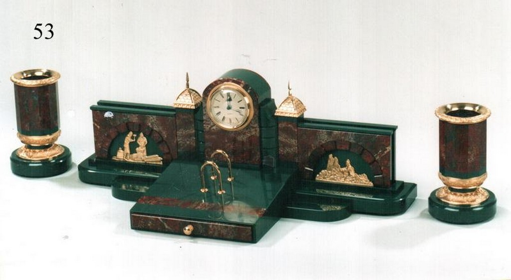 Настольный письменный набор для руководителя выполнен из материалов яшма техническая или долерит, точение, литье, точенные детали из бронзы, анодированные в цвет «золото».