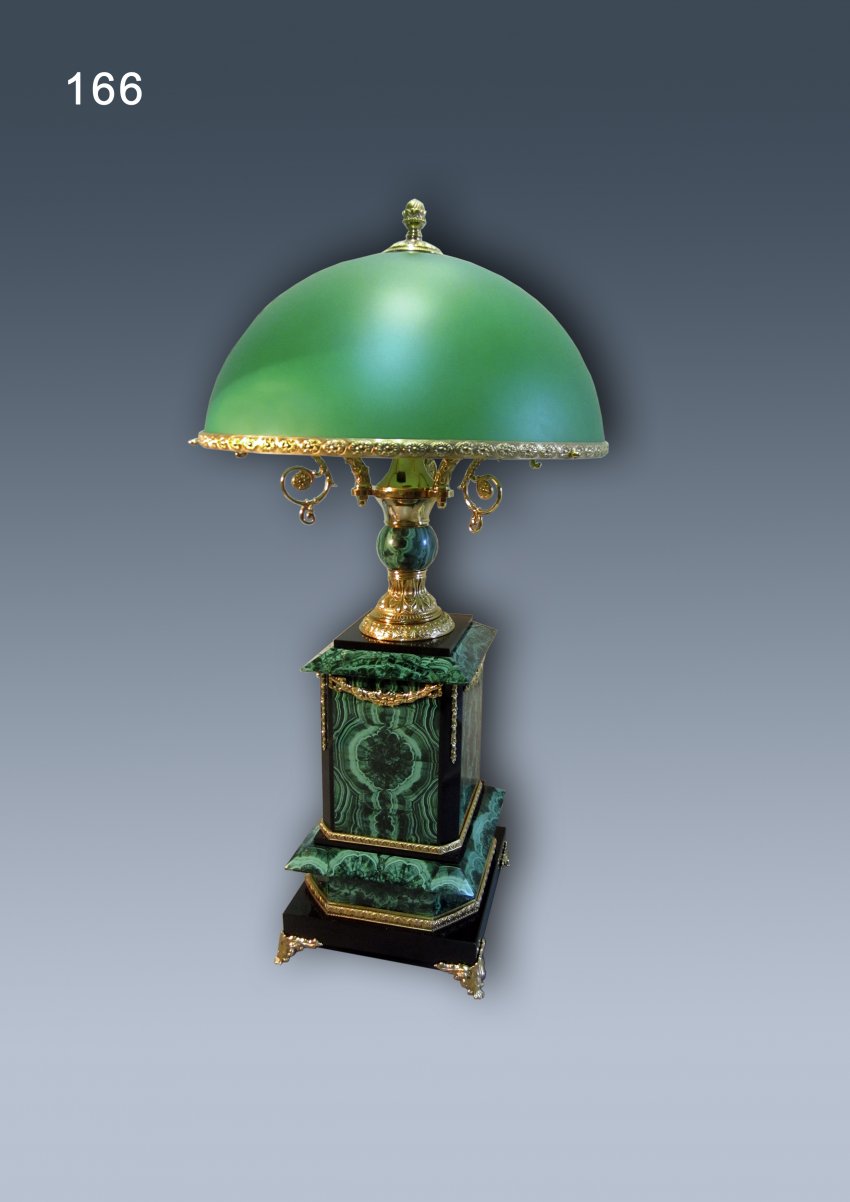 Лампа настольная изготовлена из натурального камня малахит, литье бронзаили латунь, анодированная в цвет «золото». Диаметр плафона 320 мм., высота 550-600 мм. Срок изготовления 30 дней. Цена 75 000 руб.