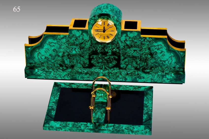 Настольный письменный набор для руководителя выполнен из материалов малахит, долерит, литья и точенные детали из бронзы, анодированные в цвет «золото». Размеры 450х280х220мм Срок изготовления 1 месяца Цена 75 000 рублей. Цена подставки под перекидной календарь — 30 000 рублей. |