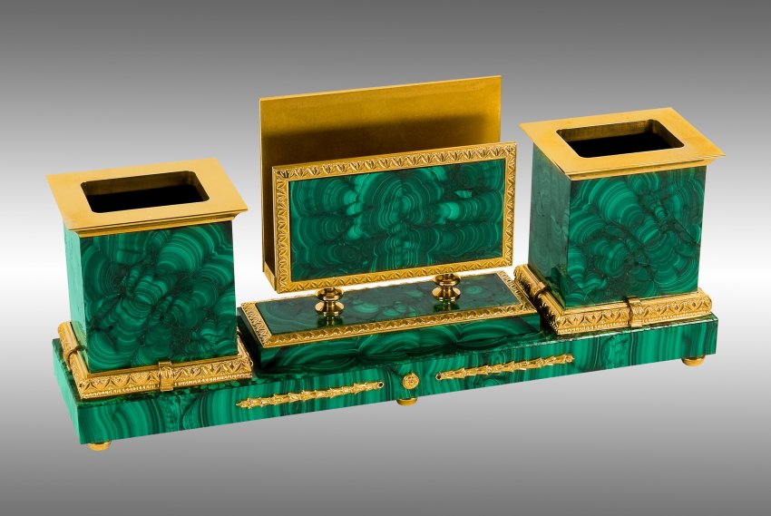 Настольный письменный набор для руководителя c подставкой под бумаги выполнен из материалов малахит, долерит, литья и точенные детали из бронзы, анодированные в цвет «золото».