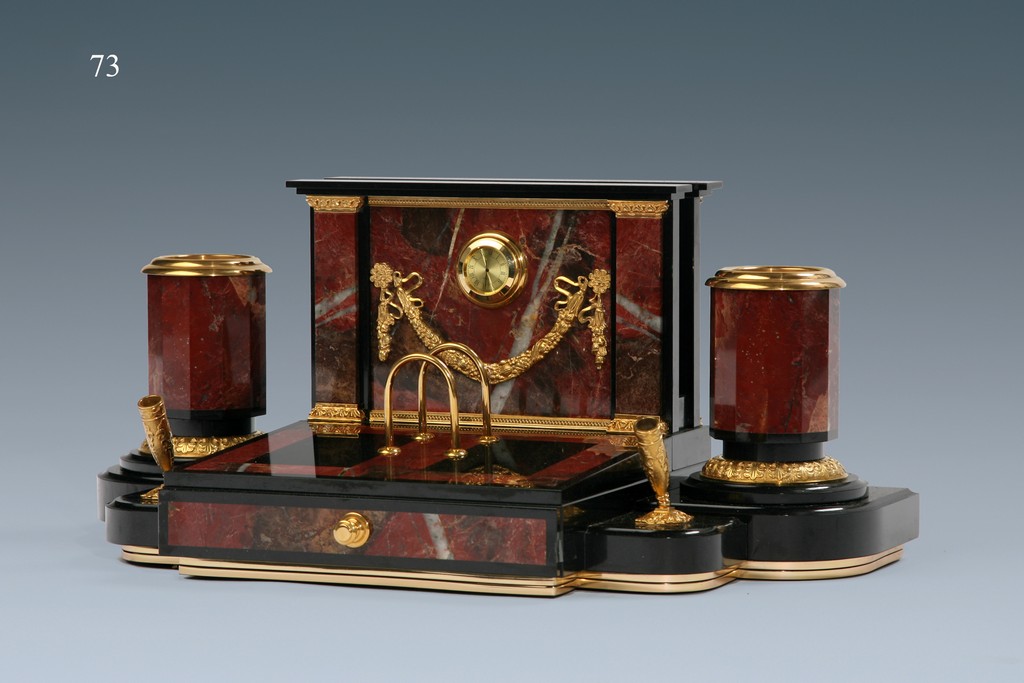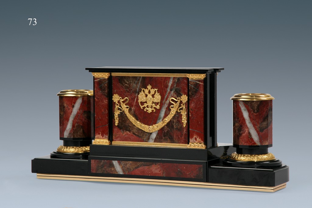 Настольный письменный набор для руководителя из материалов яшма пейзажная или кураминская, долерит, литья и точенные детали из бронзы, анодированные в цвет «золото».