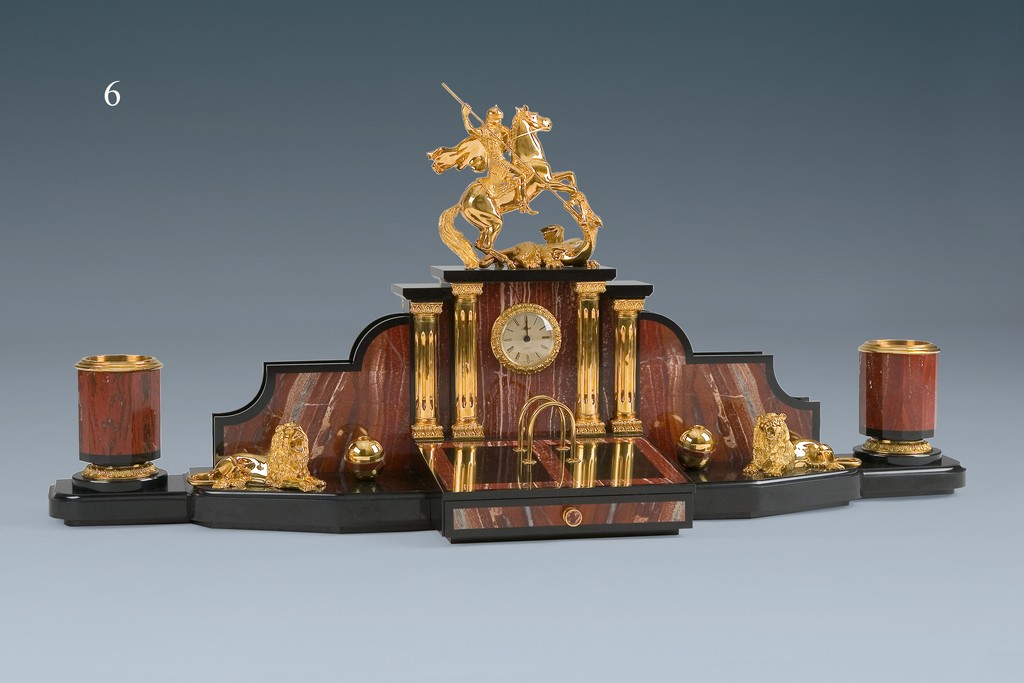 Настольный письменный набор для руководителя из материалов яшма пейзажная или кураминская, долерит, литья и точенные детали из бронзы, анодированные в цвет «золото».