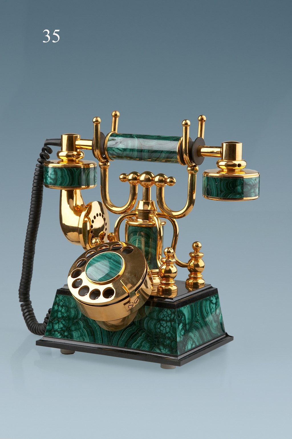 Телефон в стиле «ретро» изготовлена из натурального камня малахит, литье бронза или латунь, анодированная в цвет «золото». Размер 240х150х250мм. Срок изготовления 30 дней. Цена 52 800 руб.