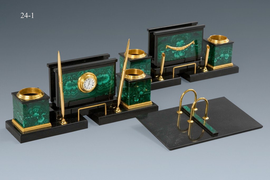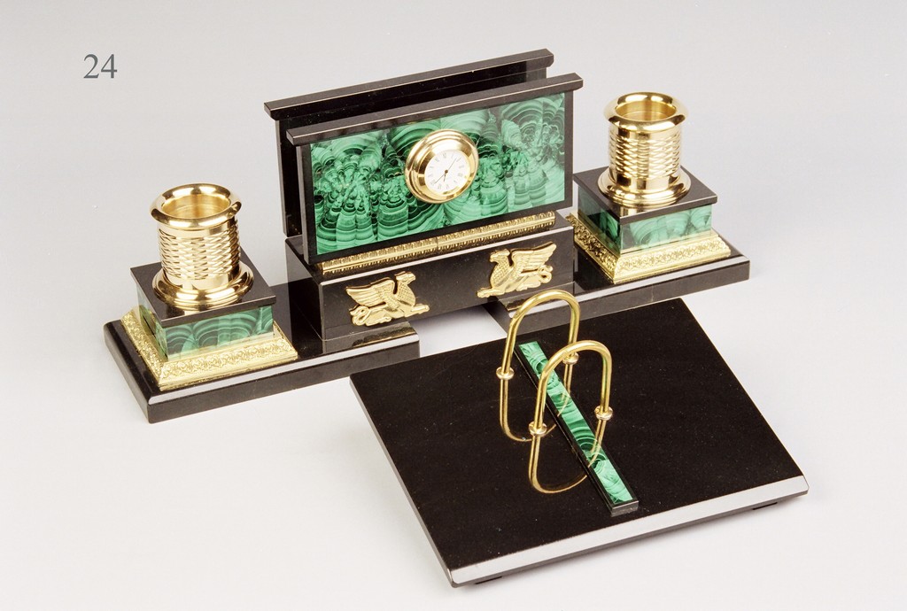 Настольный письменный набор для руководителя выполнен из материалов малахит, долерит, литья и точенные детали из бронзы, анодированные в цвет «золото».